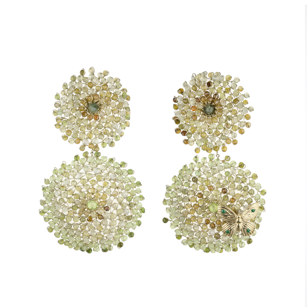 A sculptural and precious jewel, made entirely by hand. The base is worked in 925 sterling silver wire, on which numerous variegated green tourmalines are manually applied, giving a vibrant effect and a rich texture of light and depth.