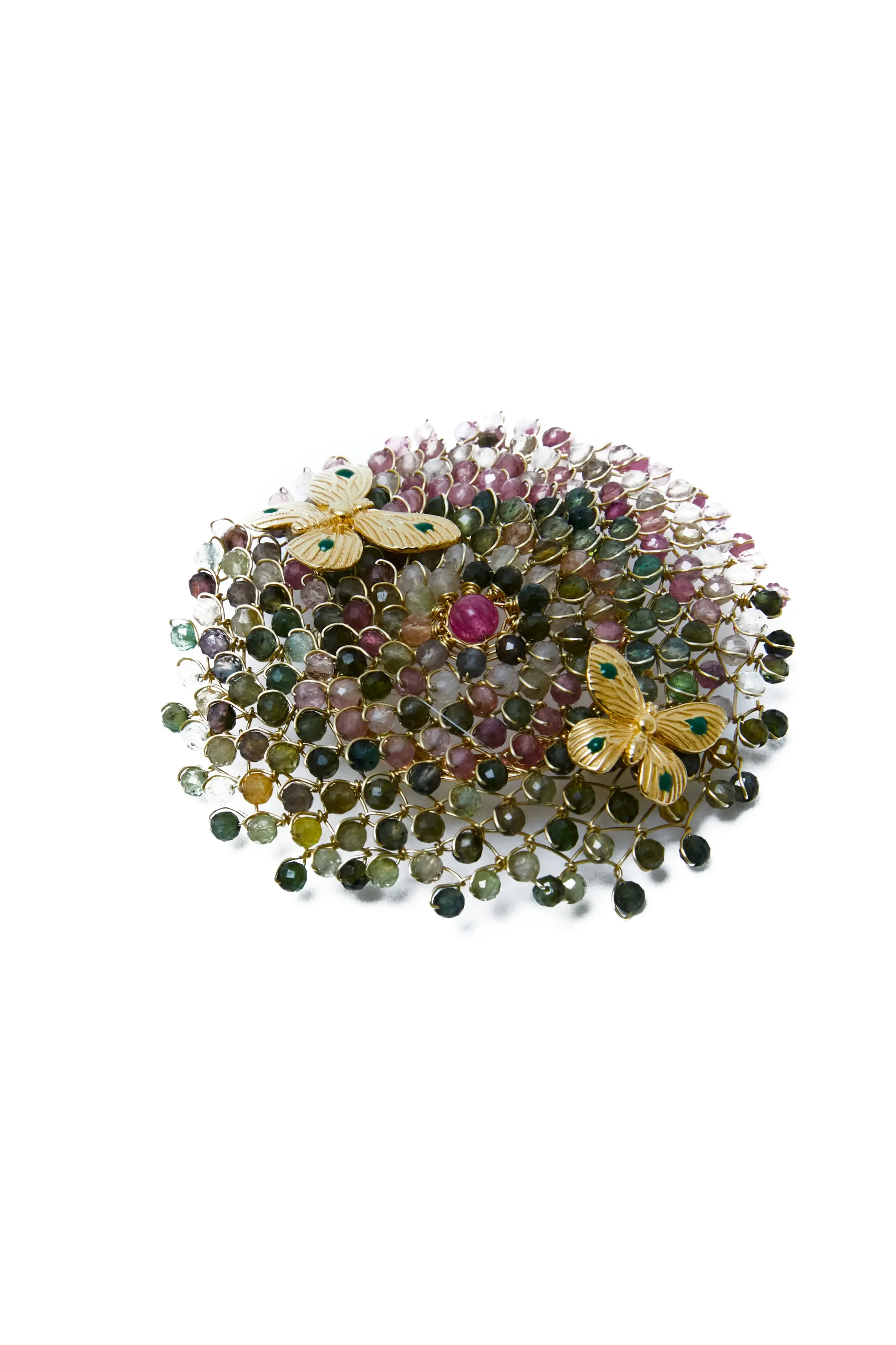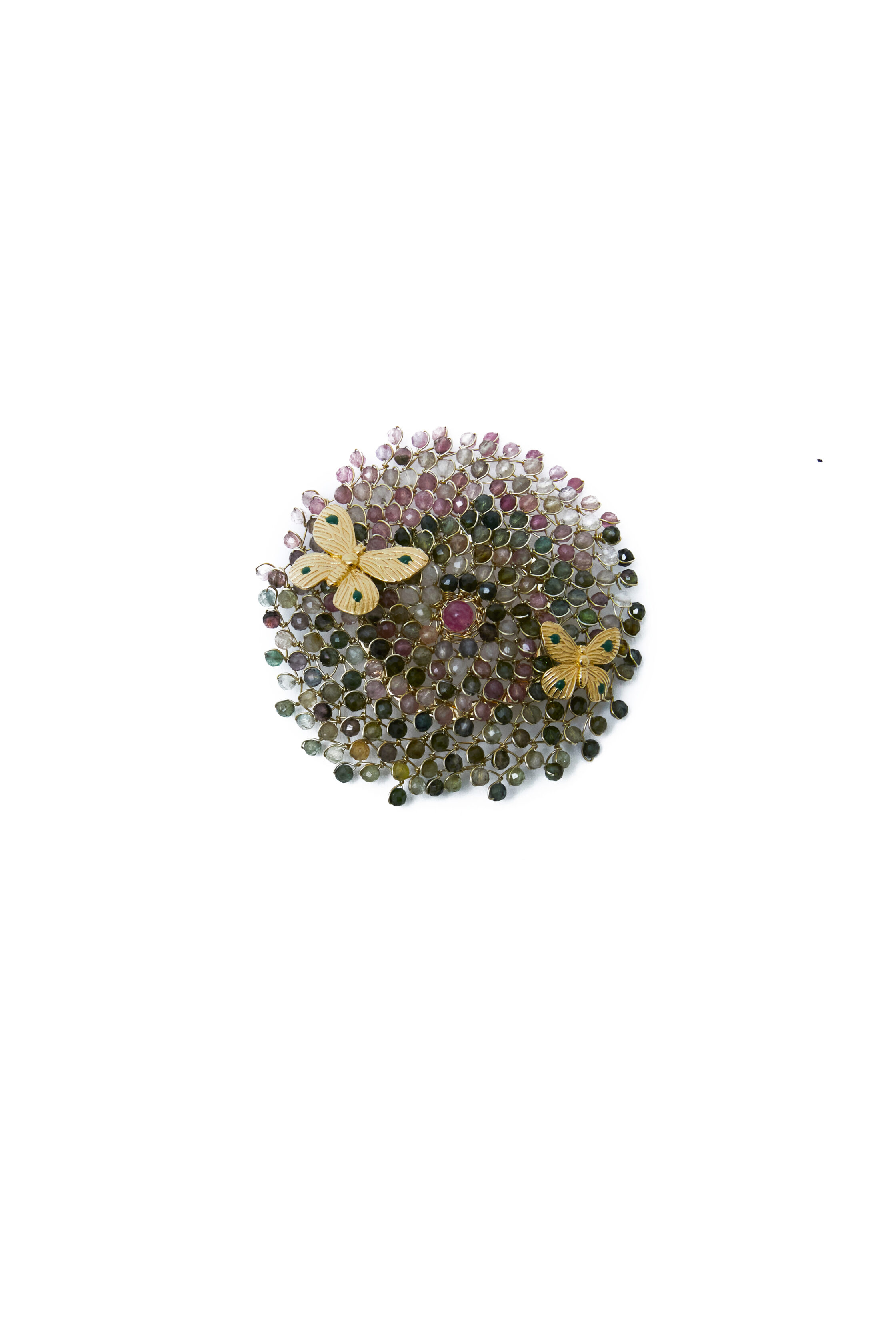 Sculptural and precious brooch, made entirely by hand. The base is worked in 925 sterling silver wire with 18kt gold electroplating, on which numerous variegated green and pink tourmalines are manually applied, giving a vibrant effect and a rich texture of light and depth.