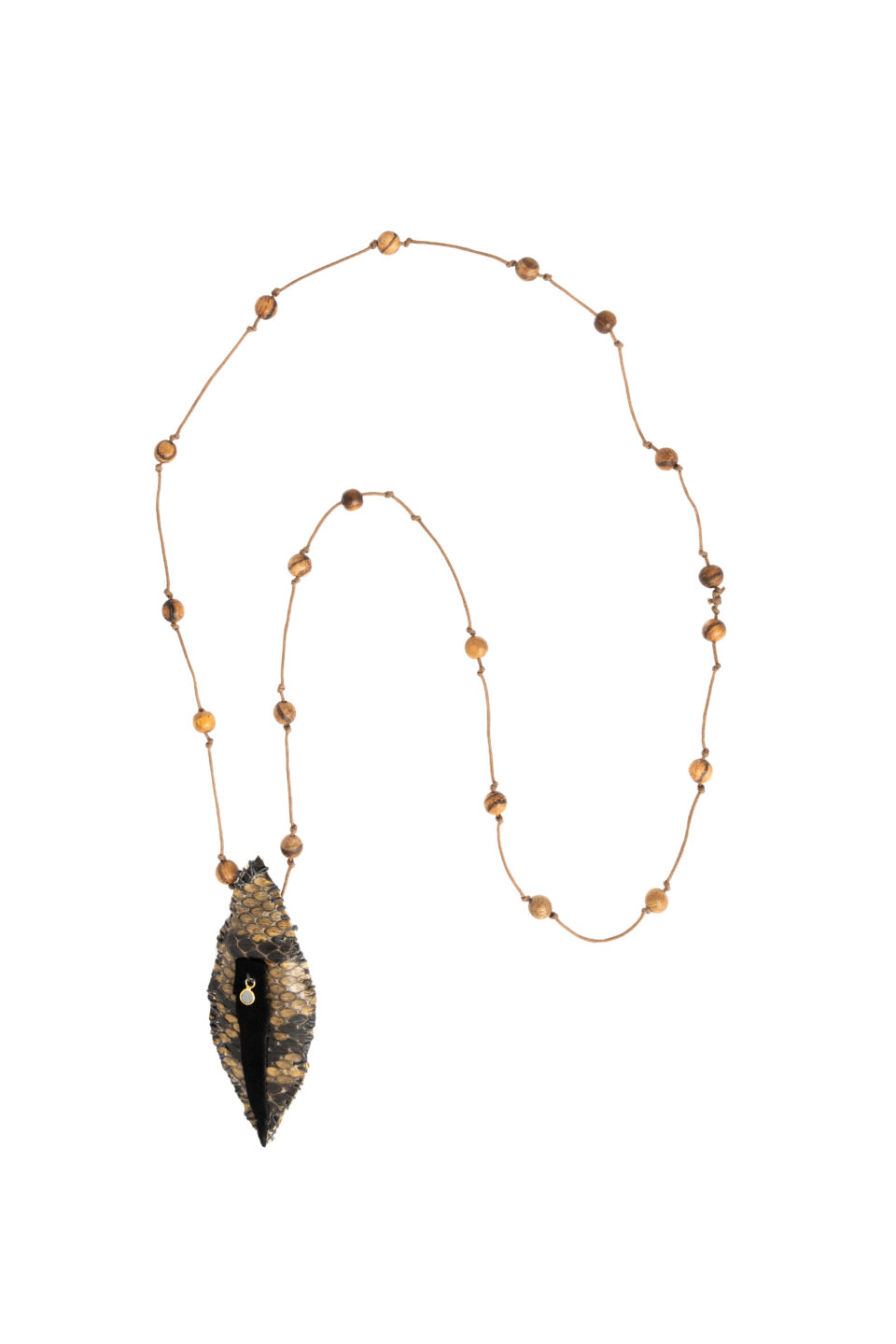 The pendant evokes deep roots with the Earth and its primordial elements. The textural texture of leather, combined with the discreet luster of gold, lends strength and warmth to a creation designed for those who like to stand out with awareness.