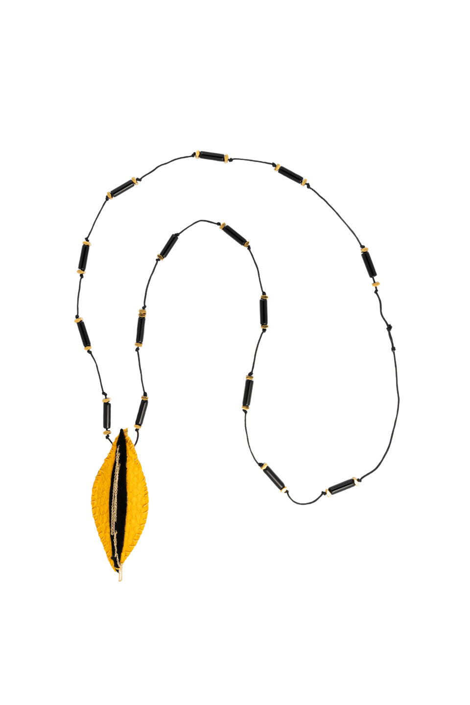 Made entirely by hand, this sculptural necklace combines precious materials and sustainability: handcrafted recycled leather, amber-colored glass beads and 18 kt yellow gold Venetian chains intertwine in a harmonious and vibrant balance.