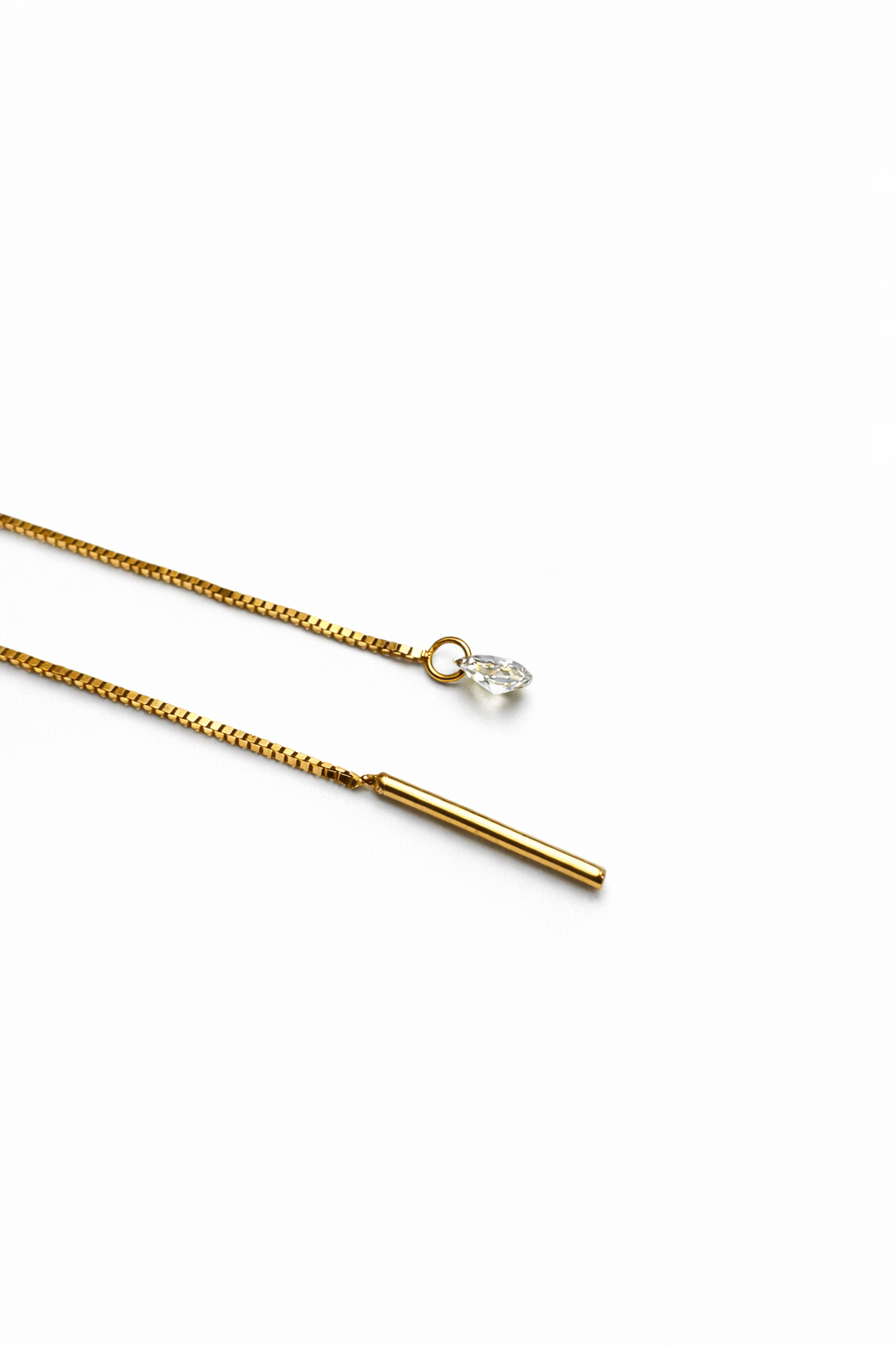 These earrings are designed as a light, almost suspended gesture that crosses the earlobe with naturalness. The 18kt yellow gold Venetian chain slides delicately through the ear, creating a refined balance between what is shown and what remains barely hinted at, in front of and behind the earlobe.