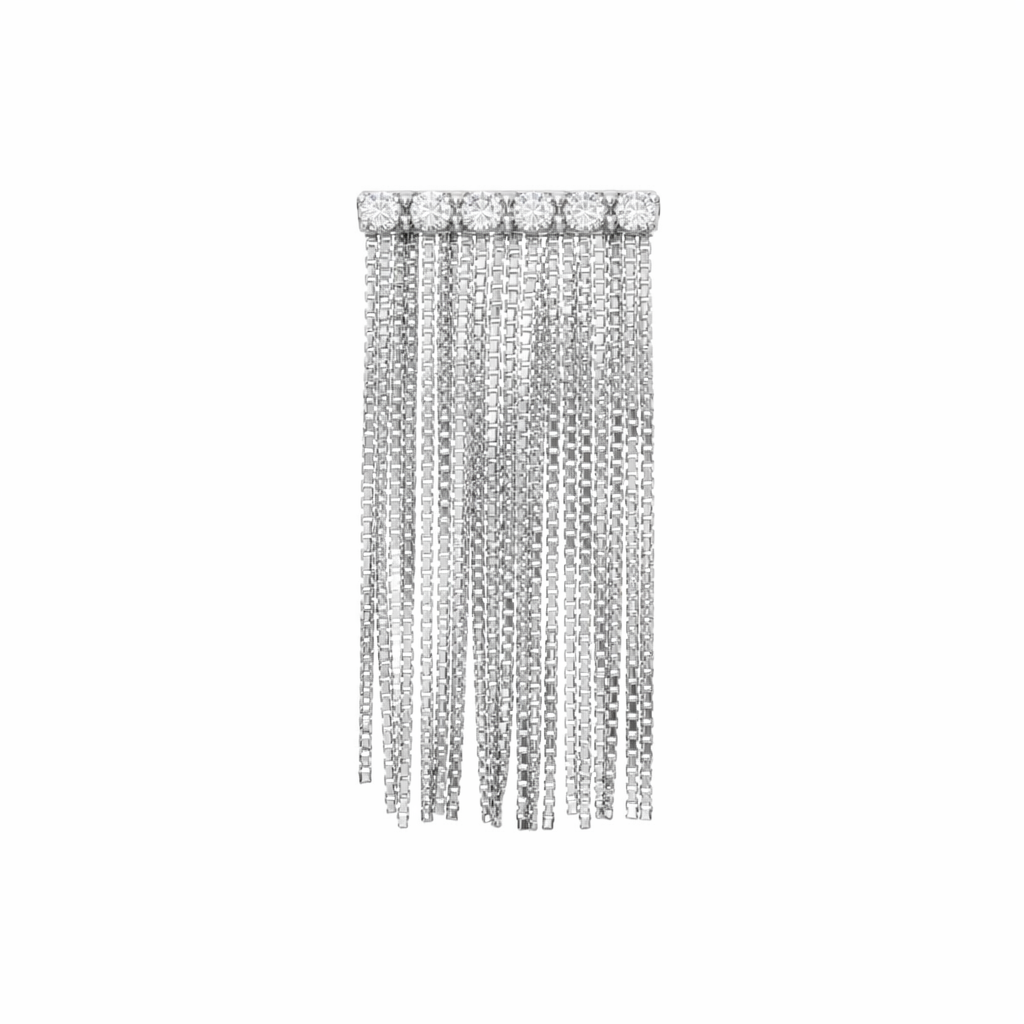 Pair of earrings consisting of a linear bar embellished with eight natural brilliant-cut white diamonds set in an 18kt rhodium-plated white gold structure, and a Mini Viky fringe from which a cascade of thin Venetian chains in 18kt rhodium-plated white gold descends.
