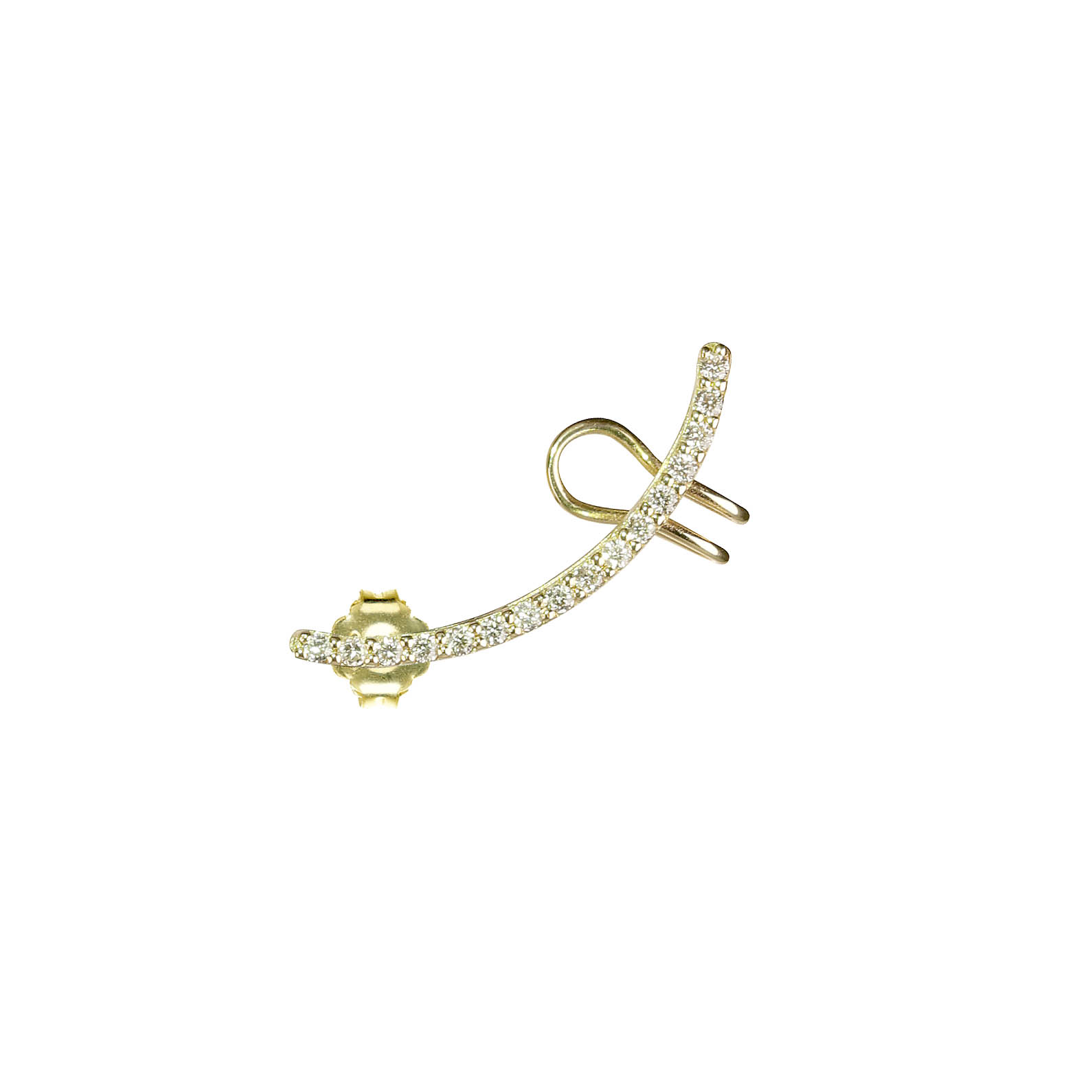 Single curved bar made of 18 kt yellow gold illuminated by 14 white diamonds.