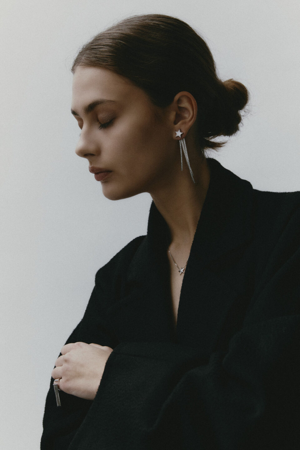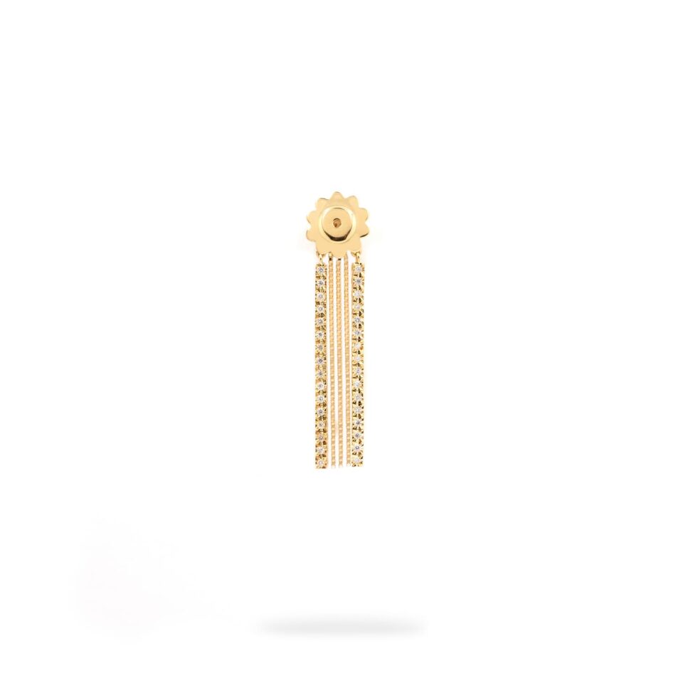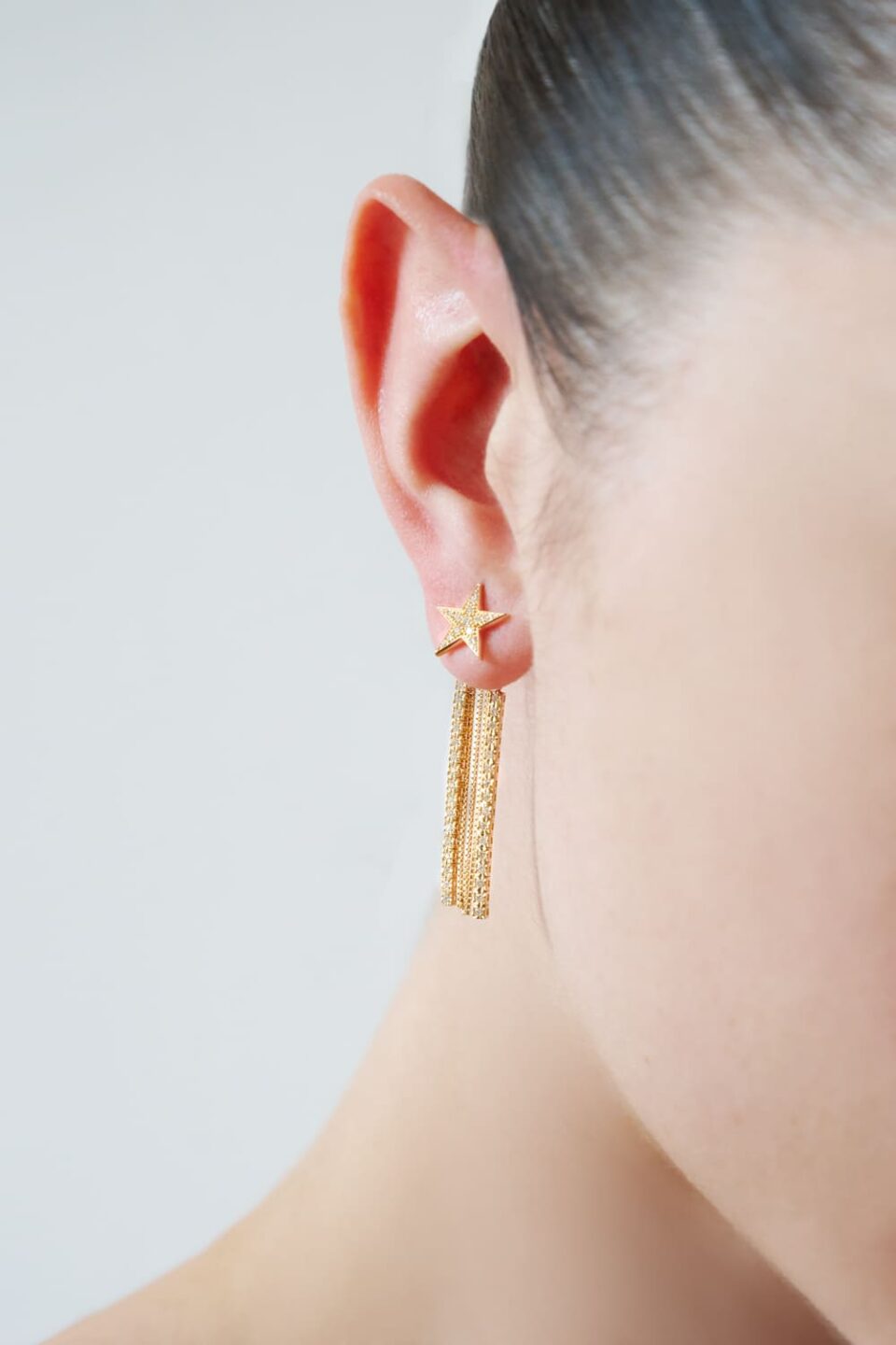 Tra loro, si intrecciano tre fili sottili di catena veneziana (3 cm), che creano un effetto dinamico e leggero, pensato per accompagnare il profilo del viso con eleganza.