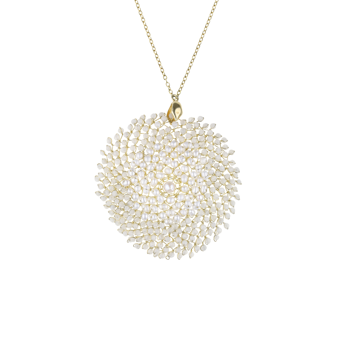 Ciondolo scultoreo e prezioso, interamente realizzato a mano. La base è lavorata in filo di argento 925 con galvanica oro 18kt, sul quale vengono applicate manualmente perle bianche nella parte centrale e pietre di luna nella parte esterna dell’elemento decorativo, per dare un effetto vibrante e una texture ricca di luce e contrasto.