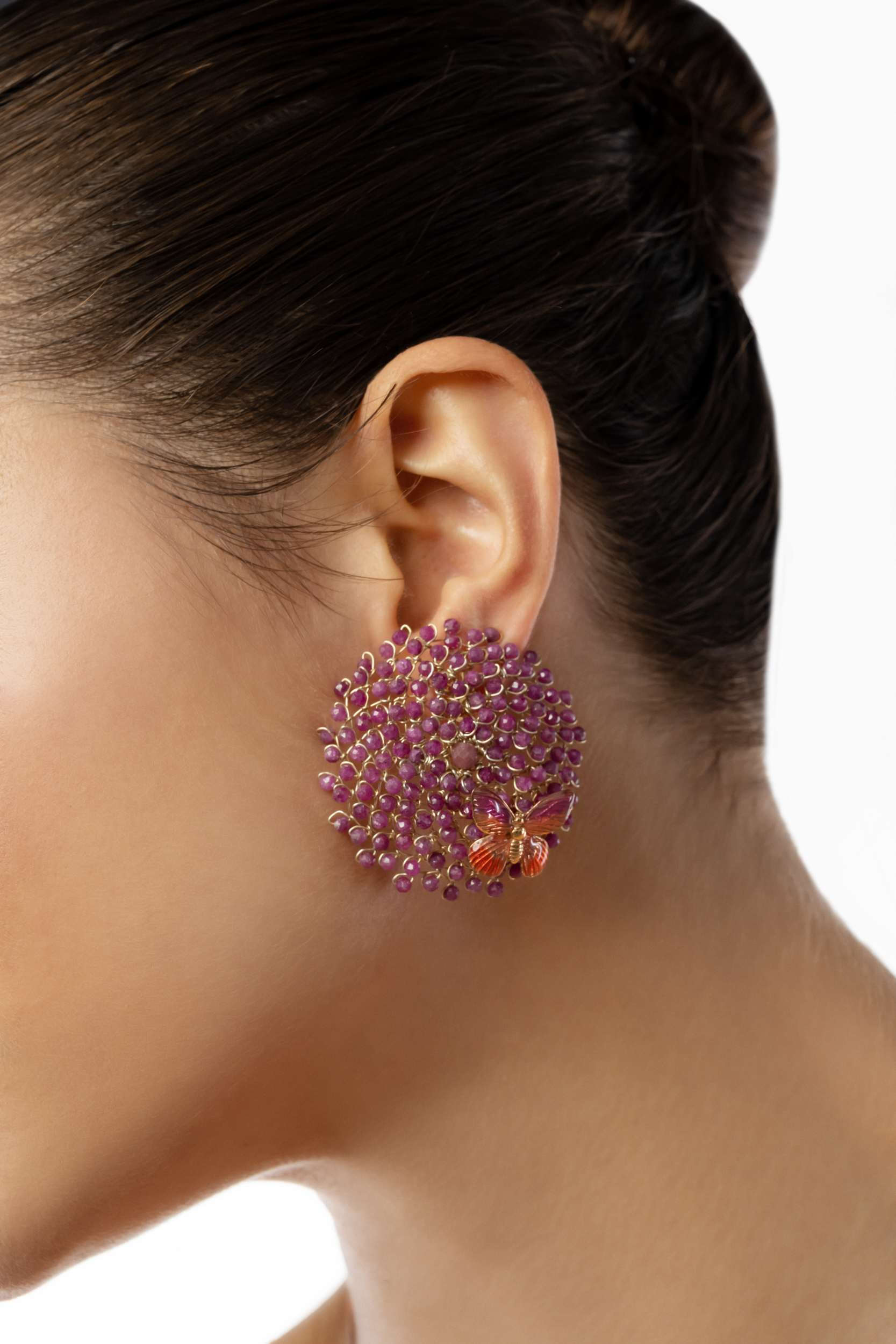 Coppia di orecchini scultorei e preziosi, interamente realizzato a mano. La base è lavorata in filo di argento 925 con galvanica oro 18kt, sul quale vengono applicate manualmente numerosi rubini, che donano un effetto vibrante e una texture ricca di luce e profondità.