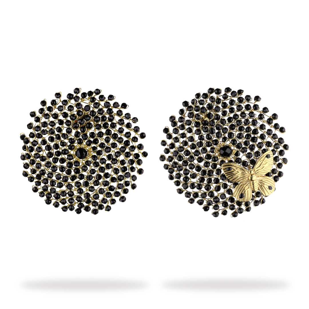 A completare il design, una farfalla medium che si posa leggera sul fiore. La farfalla è presente soltanto su un orecchino ed e galvanizzata in oro giallo 18kt.