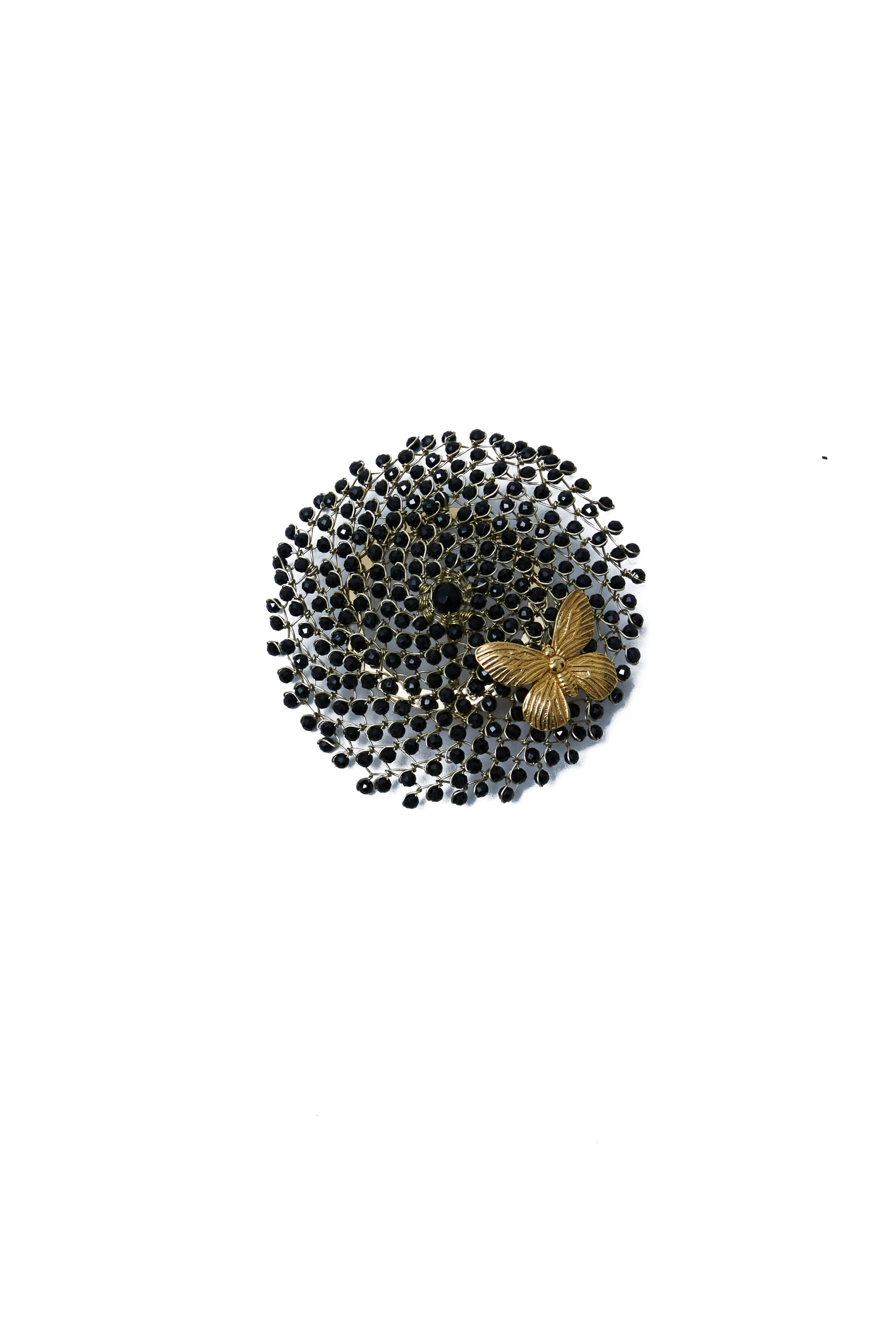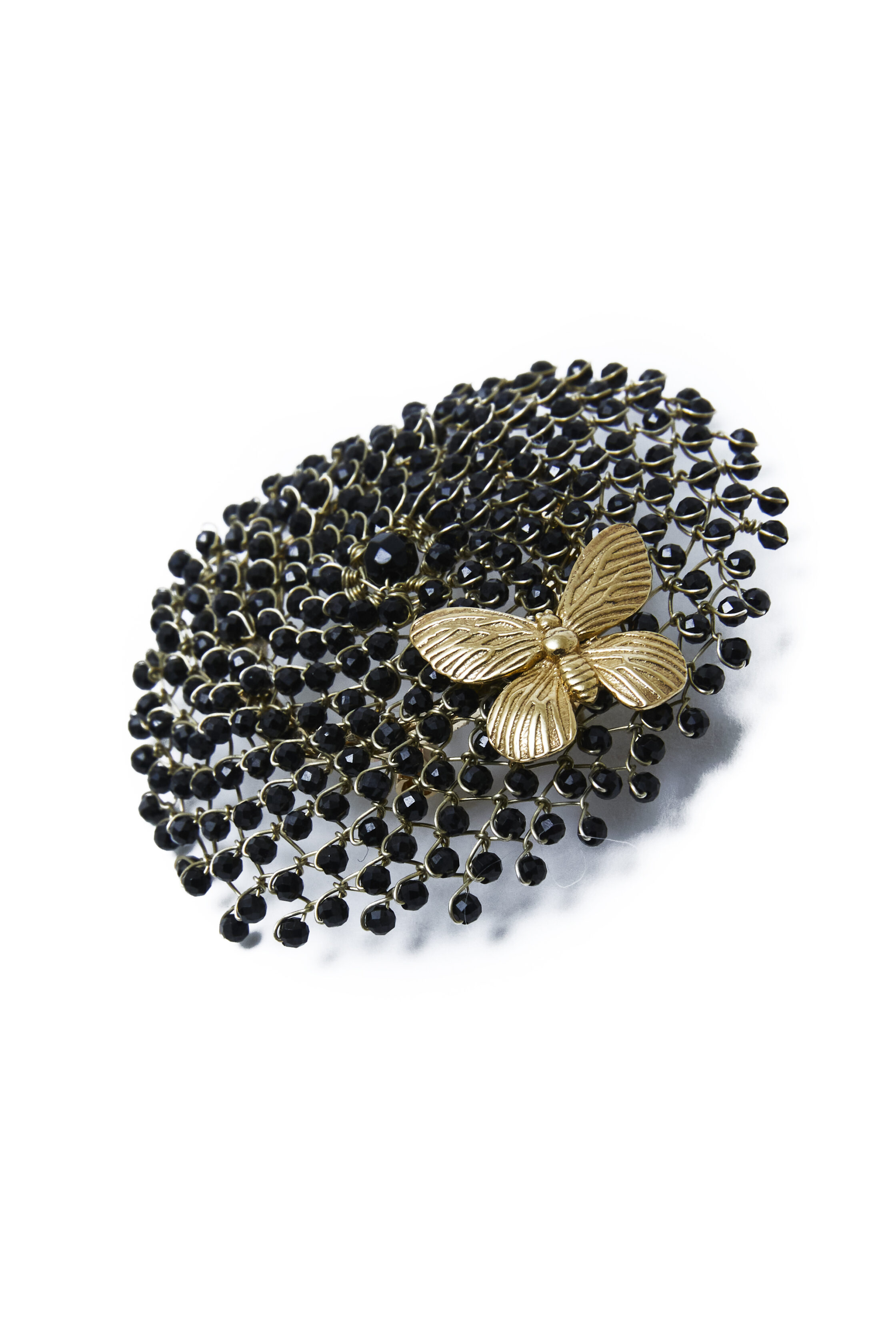 Spilla scultorea e preziosa, interamente realizzata a mano. La base è lavorata in filo di argento 925 con galvanica oro 18kt, sul quale vengono applicate manualmente numerose spinelli neri, che donano un effetto vibrante e una texture ricca di luce e profondità.
