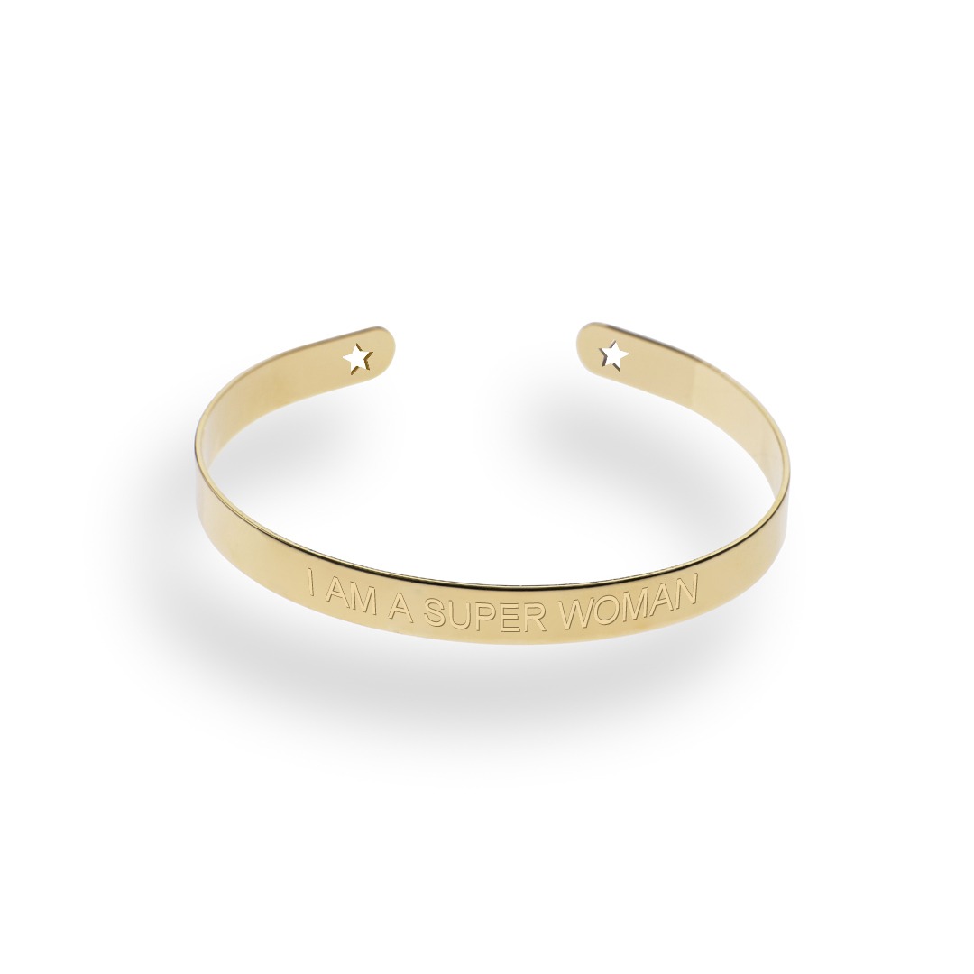 Un bracciale rigido dal carattere deciso ed elegante, realizzato in ottone 100% nickel free con raffinata galvanica in oro 18kt. La silhouette minimalista incontra un messaggio potente: la scritta incisa “I am a super woman” celebra forza, determinazione e consapevolezza. Le stelle delicatamente scavate alle estremità aggiungono un tocco simbolico e luminoso, evocando energia, sogni e ambizione.