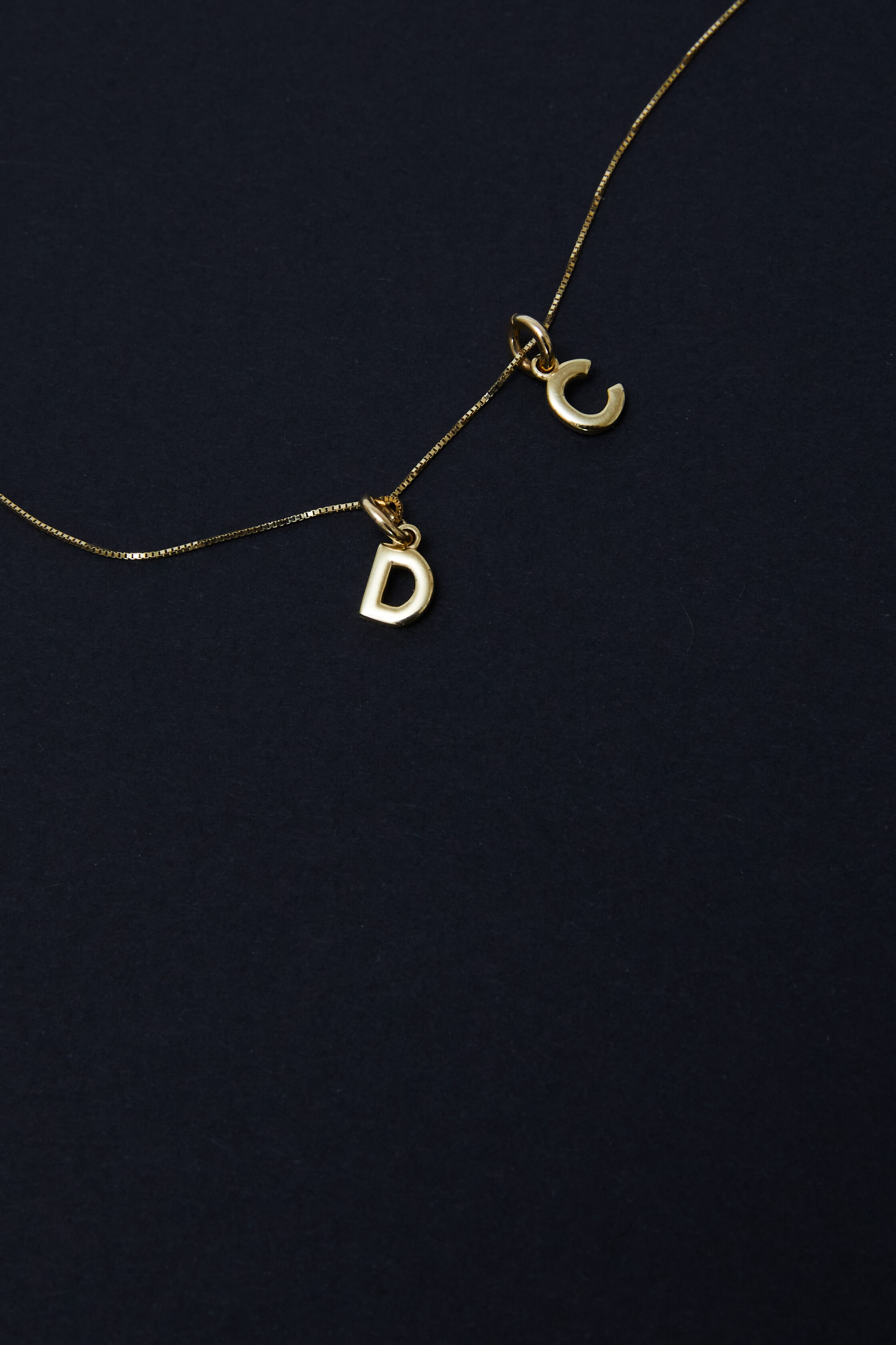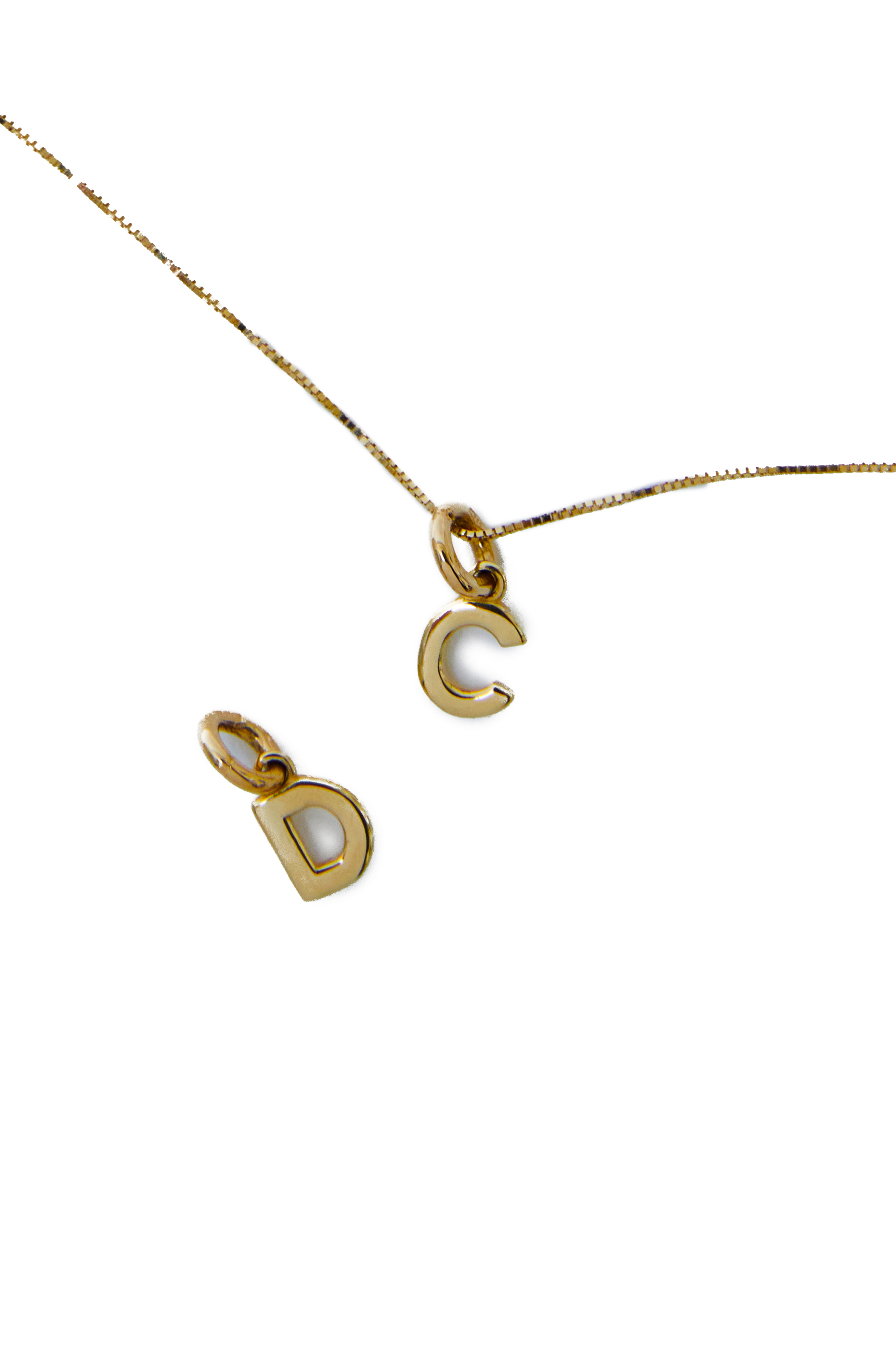 La catena veneziana in oro giallo 18 kt avvolge il collo con eleganza essenziale, mentre i piccoli ciondoli a forma di lettera si muovono liberi, creando una composizione unica e dinamica.