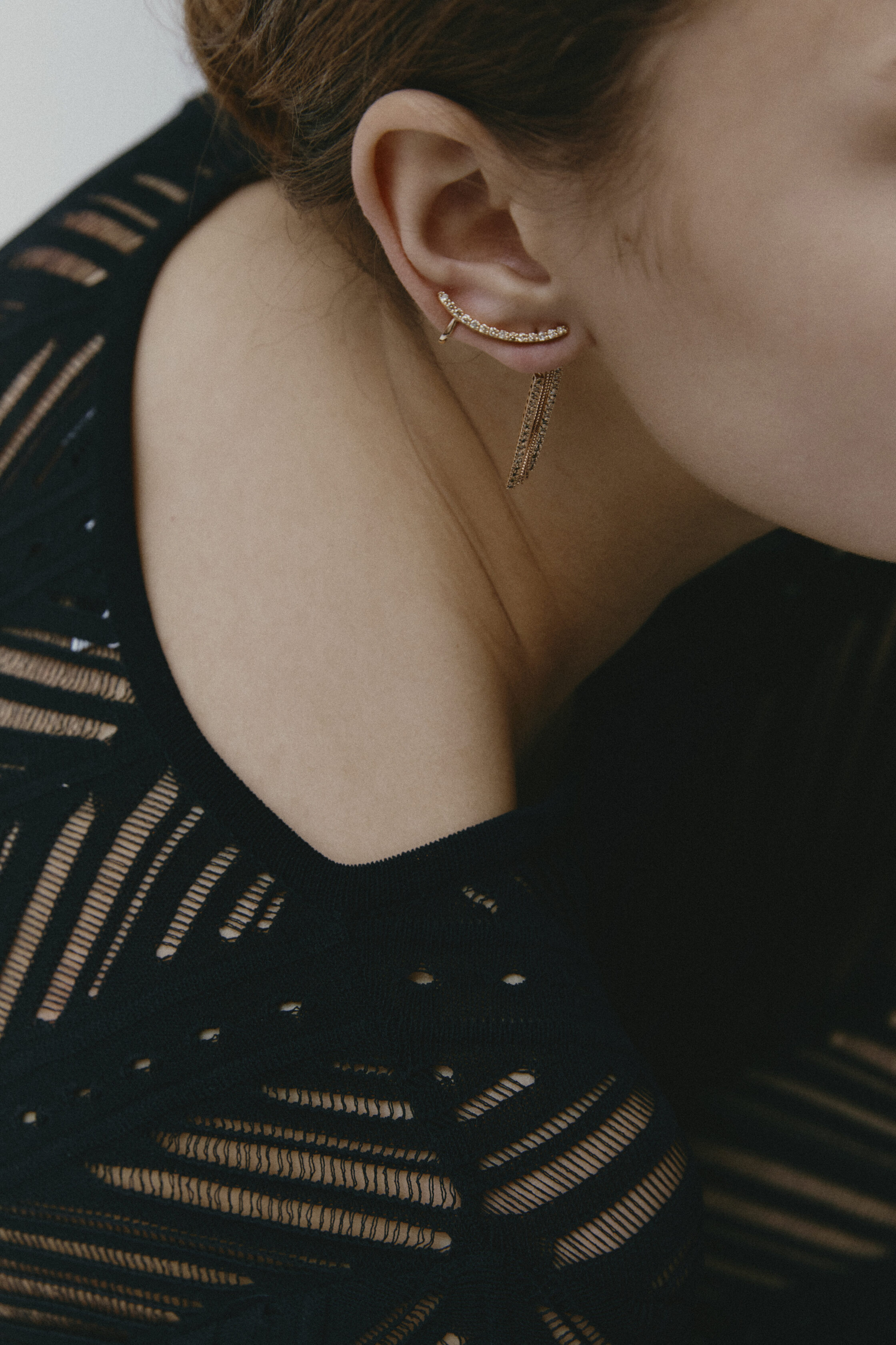 Tra loro, si intrecciano tre fili sottili di catena veneziana (3 cm), che creano un effetto dinamico e leggero, pensato per accompagnare il profilo del viso con eleganza.