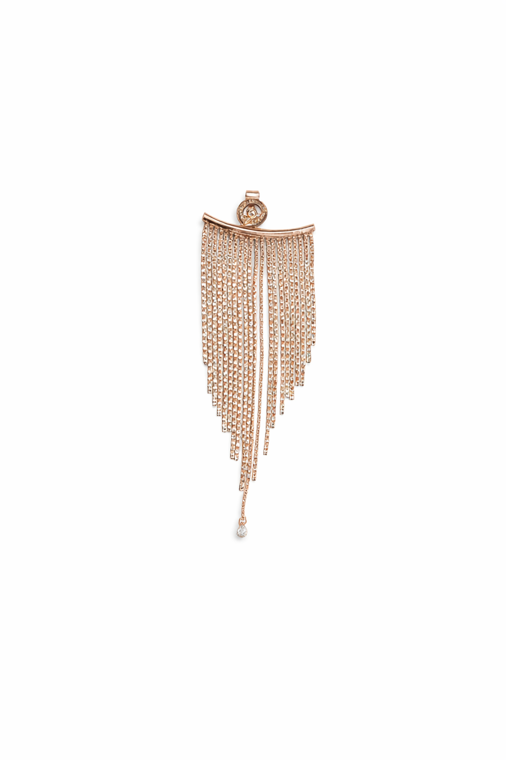 Un retro orecchino che diventa gioiello a sé: una catena veneziana in oro rosa 18 kt, composta da maglie finemente scalate, scende con eleganza creando un movimento fluido e luminoso. Al centro, sulla maglia più lunga, è sospeso un diamante bianco “nudo”, lasciato libero di catturare la luce in tutta la sua purezza.