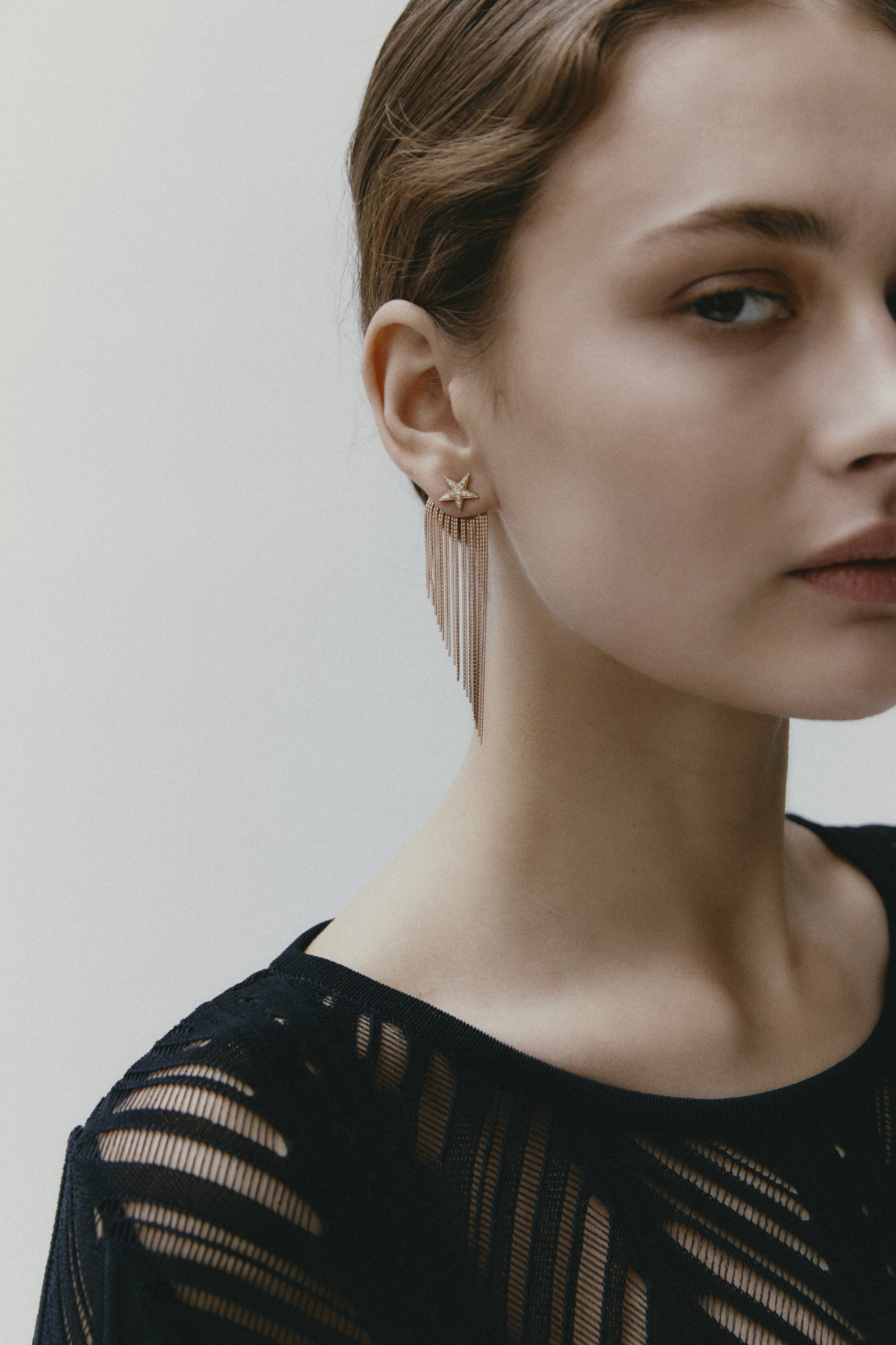 Il design “Multipli Desideri” si distingue per la sua versatilità: si aggancia direttamente al perno dell’orecchino, offrendo un’inedita possibilità di personalizzazione e movimento. Le frange in catena veneziana, leggere e armoniose, si sviluppano in lunghezze decrescenti da 65 a 35 mm, creando un raffinato gioco di volumi e luci dietro al lobo.