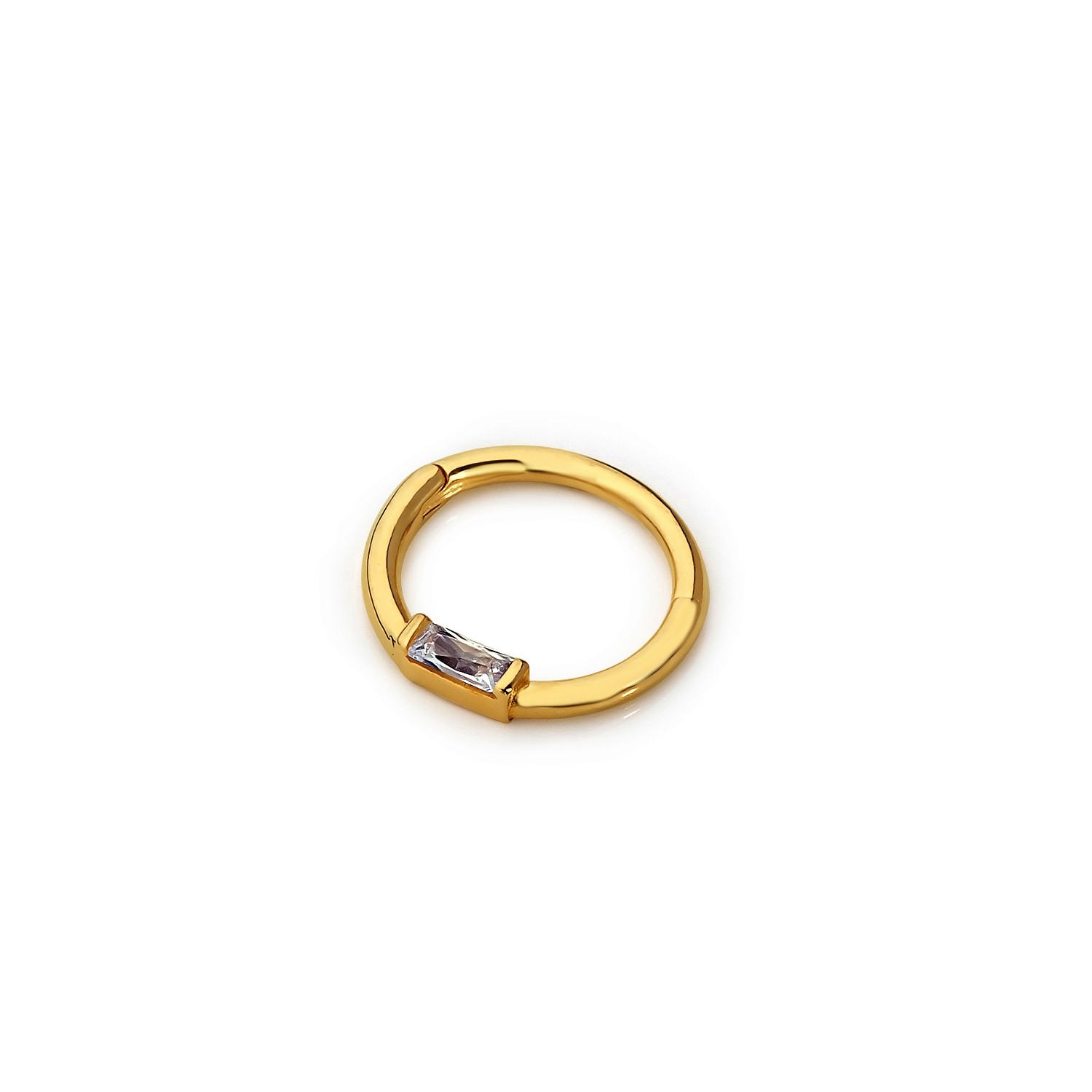 La sua baguette di diamante bianco dona equilibrio e delicatezza – un piercing perfetto per chi cerca un gioiello discreto ma studiato, capace di integrarsi con qualsiasi composizione.