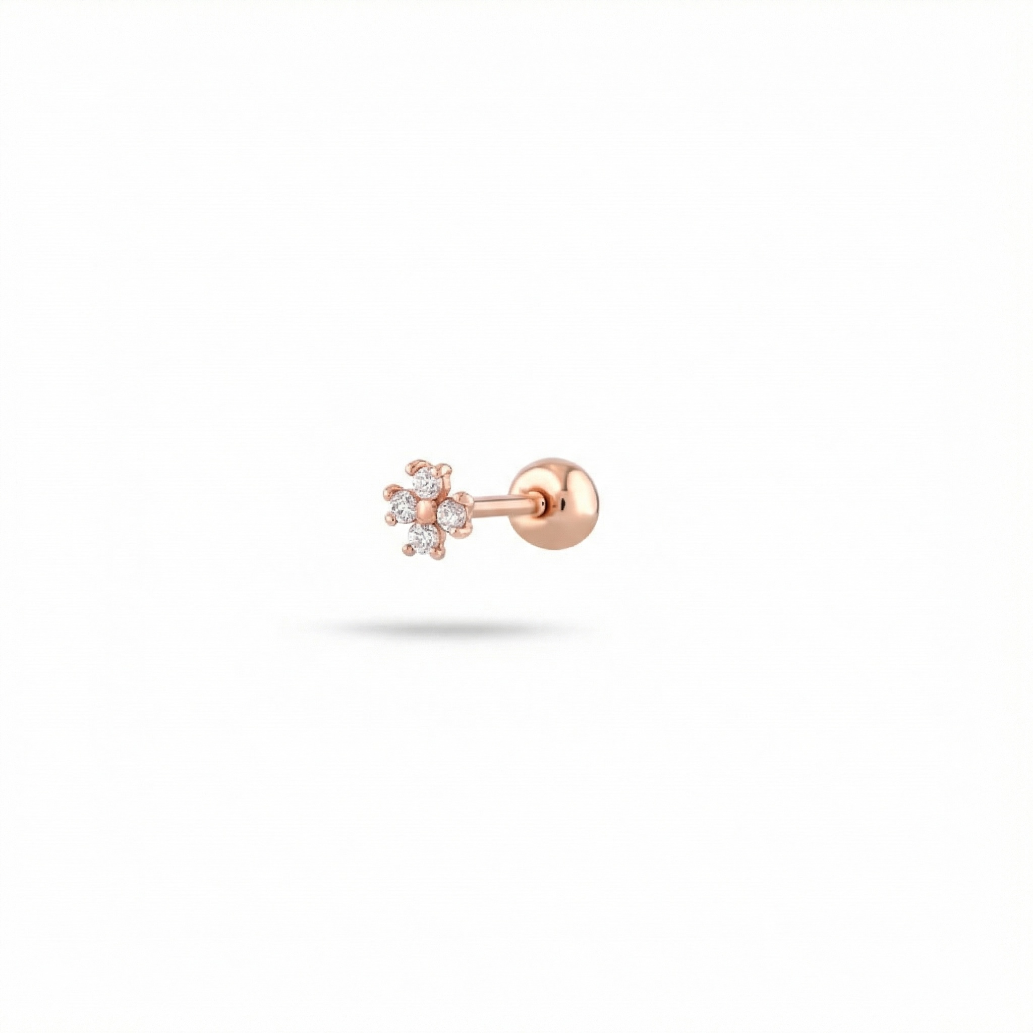 Piccolo Quadrifoglio è un piercing essenziale e poetico, in cui quattro diamanti taglio brillante si incontrano formando un delicato fiorellino, simbolo di purezza, rinascita e grazia silenziosa.
