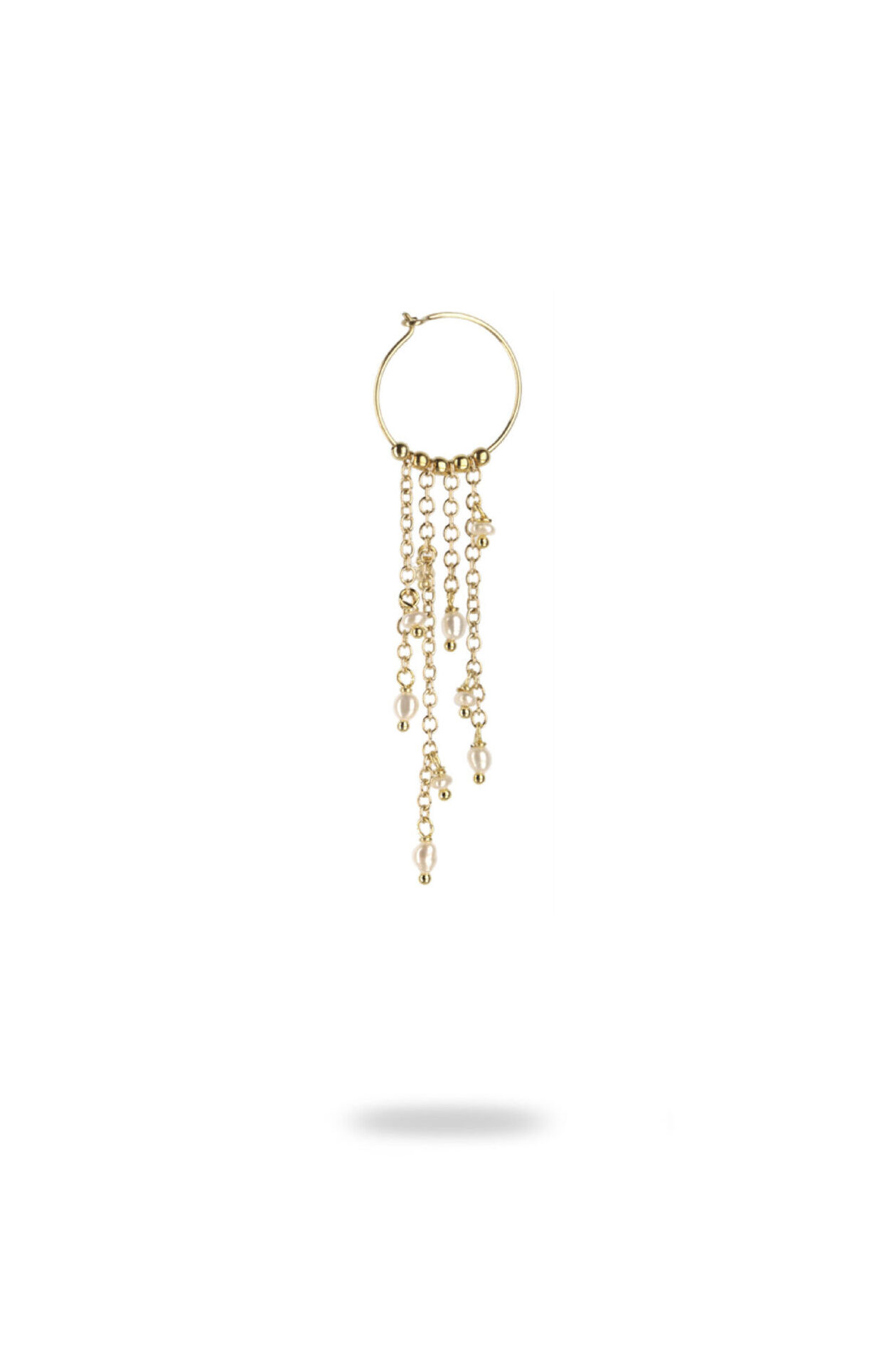 Orecchino in oro giallo 9 carati con base circolare, da cui scendono quattro catene rolò di diverse lunghezze. Ogni catena è impreziosita da micro perle di fiume irregolari, inserite a mano, che donano ritmo e delicatezza. Un design elegante e contemporaneo, che celebra la leggerezza delle perle in dialogo con la preziosità dell’oro.