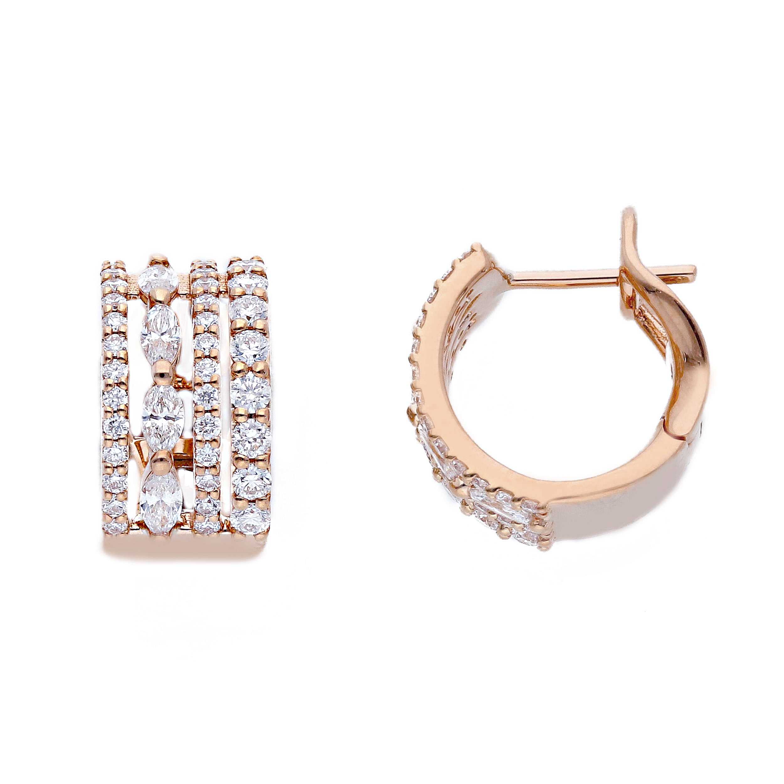Via Lattea è una coppia di orecchini in oro rosa 18kt in cui i diamanti bianchi naturali disegnano quattro scie luminose, come un cielo notturno attraversato da stelle in movimento.