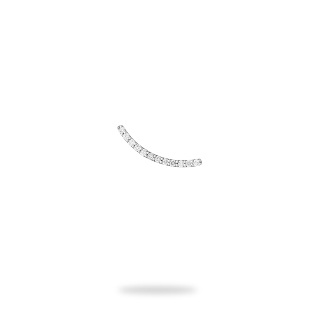 Questo orecchino singolo in oro bianco rodiato 18kt accoglie una delicata curvatura impreziosita da diamanti bianchi, per una caratura totale di 0.22 ct.