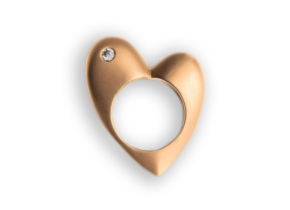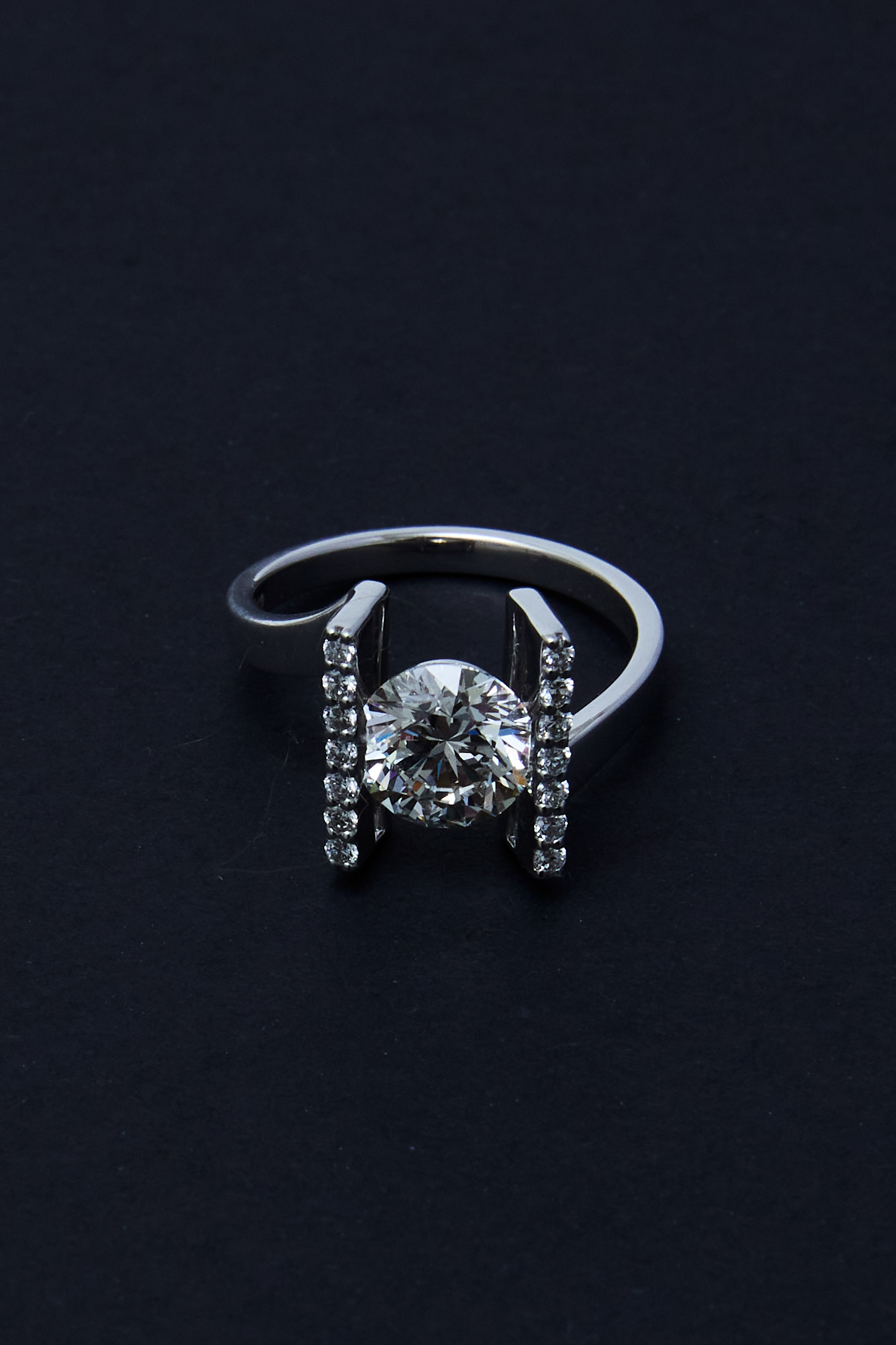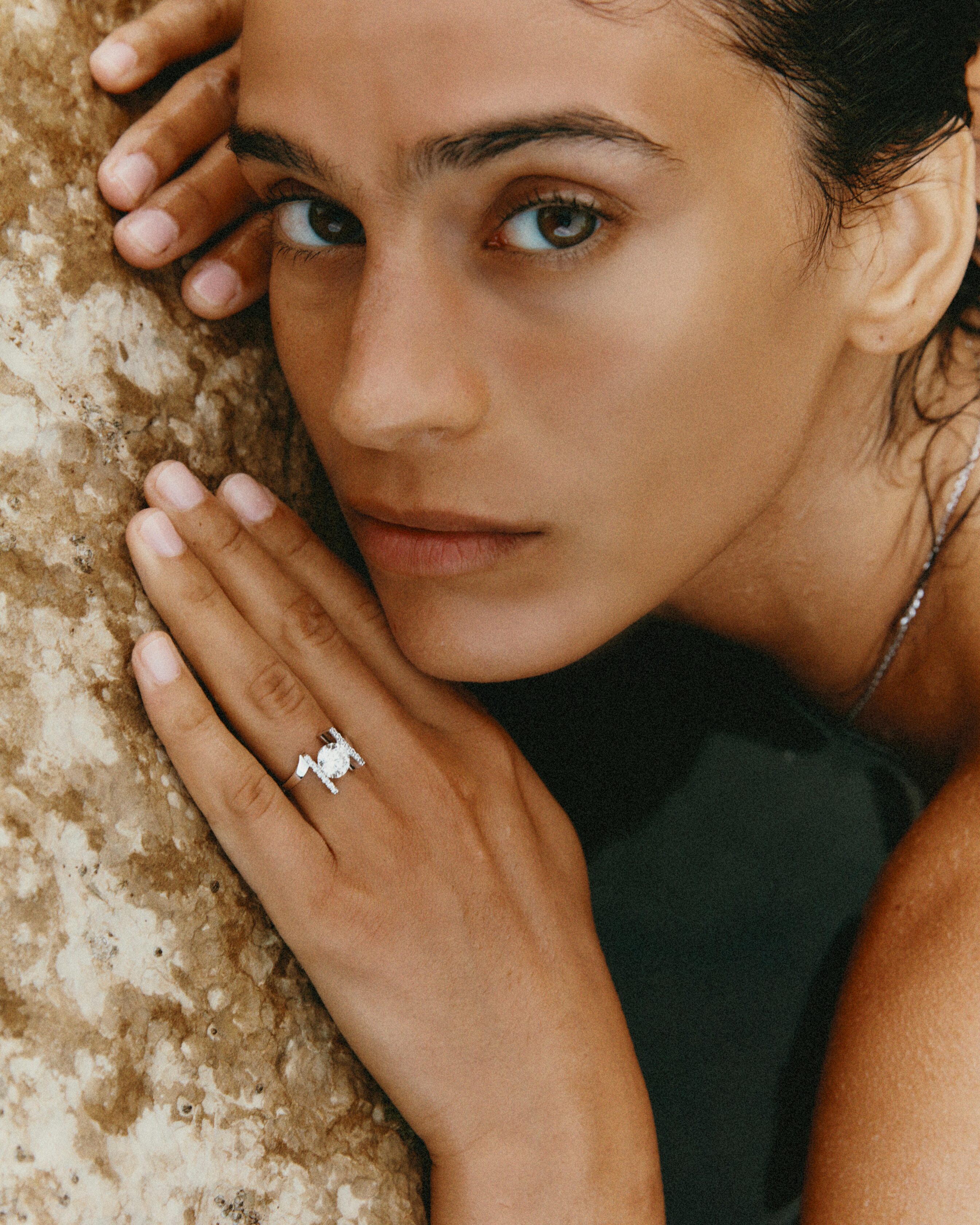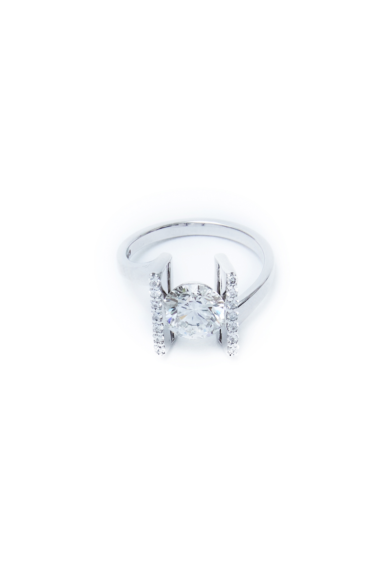 Il diamante centrale, di straordinaria purezza e luminosità, è sostenuto da due barrette laterali di sette diamanti per lato il cui significato è “Io ci sono. Accanto a te, ti sostengo.“. Un gioco di riflessi che celebra l’incontro tra eleganza e sentimento.