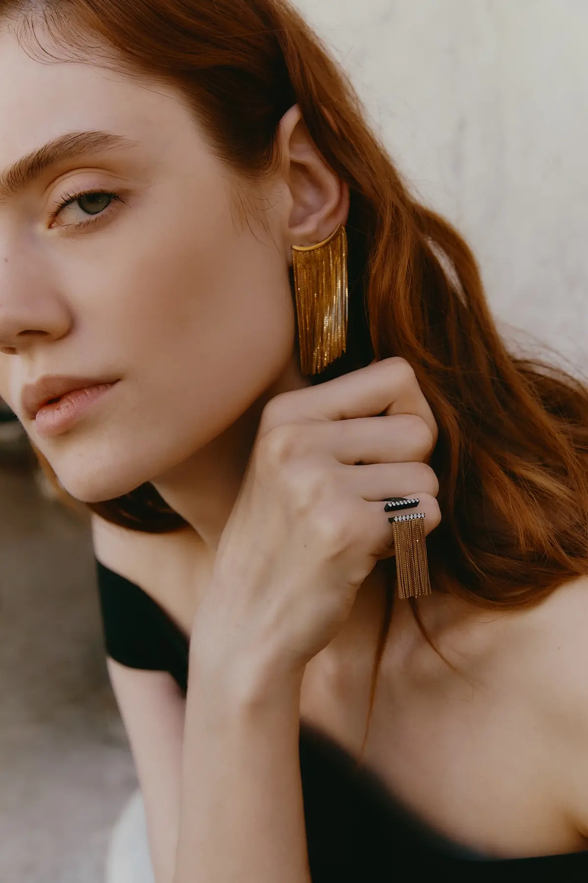 Da una delle due estremità scendono 28 sottili frange di catena veneziana lunghe 3 cm che accarezzano la mano con grazia, creando un movimento fluido e raffinato.