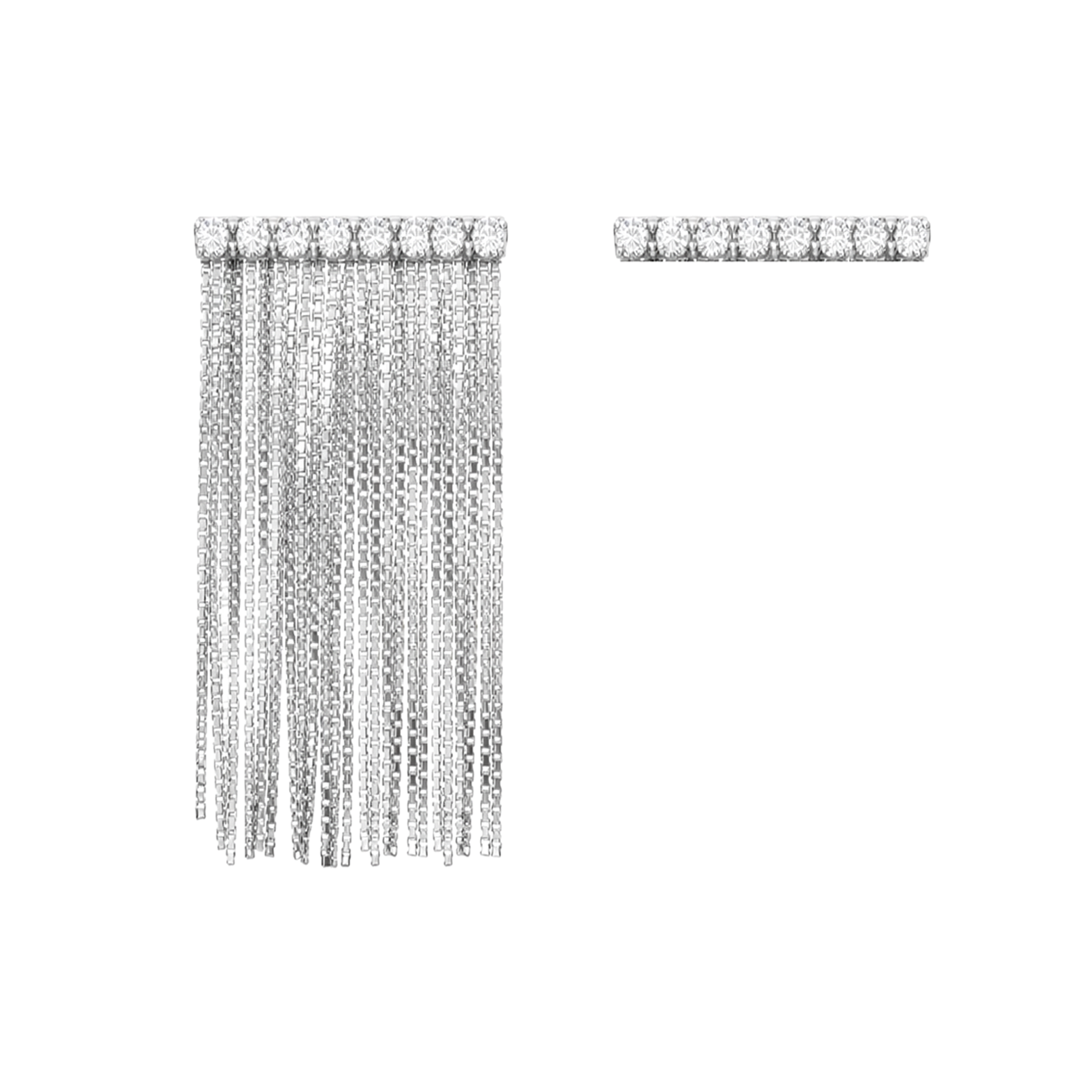 Coppia di orecchini composta da una barretta lineare impreziosita da diamanti bianchi naturali incastonati in una struttura di oro bianco rodiato 18kt, e una frangia Mini Viky da cui scende una cascata di sottili catene veneziane in oro bianco rodiato 18kt.
