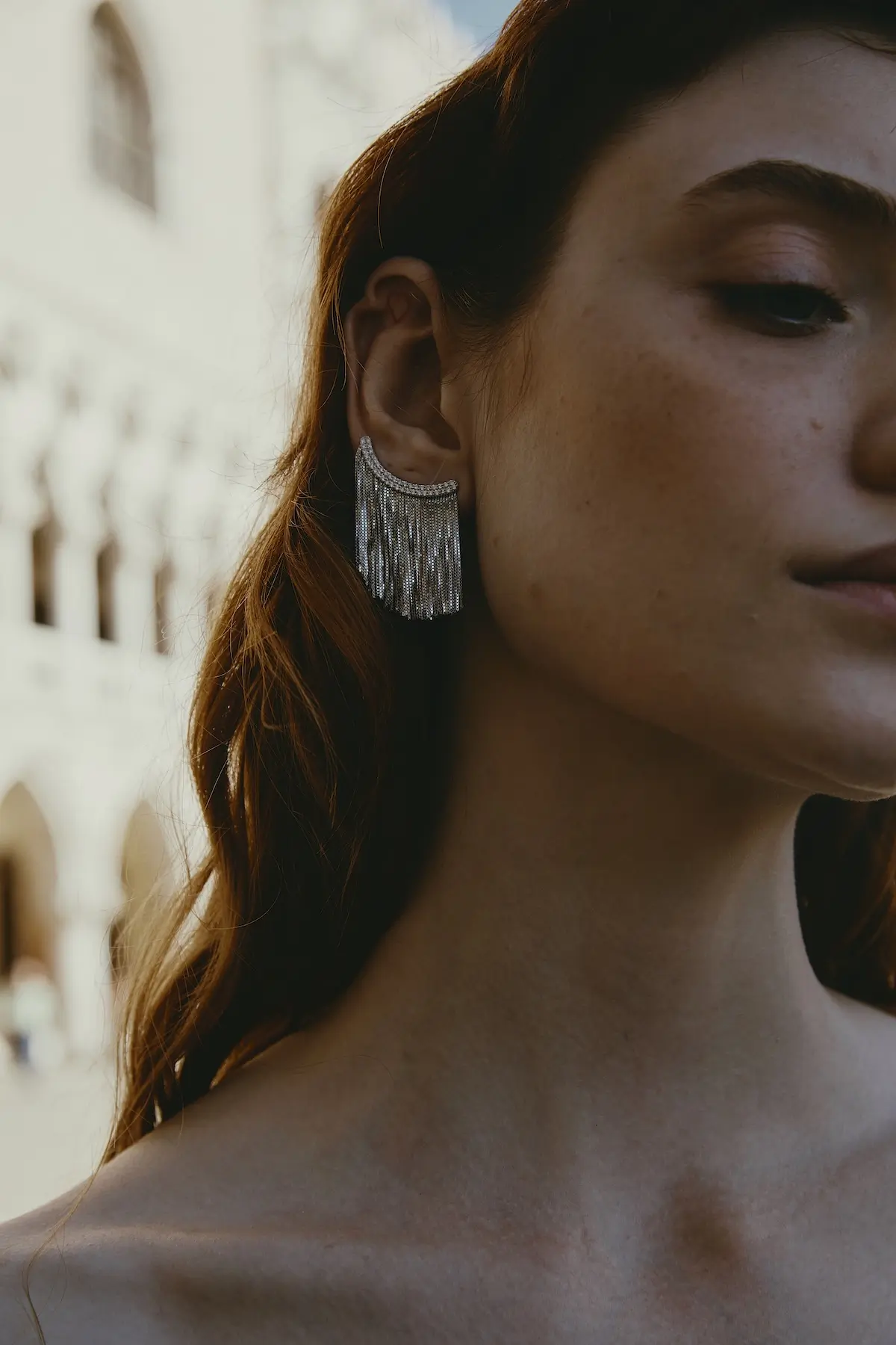 Un gioco di luce e movimento. Le frange di 57 catene veneziane in oro bianco rodiato 18 kt danzano con ogni gesto, catturando la luce in un fluire raffinato.